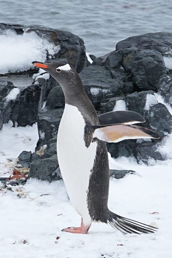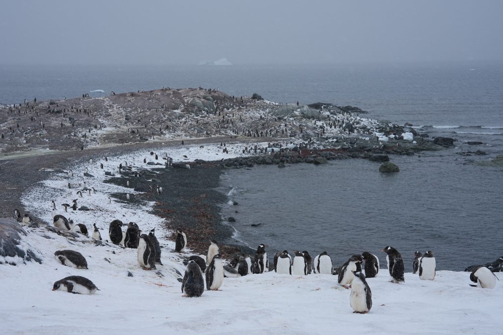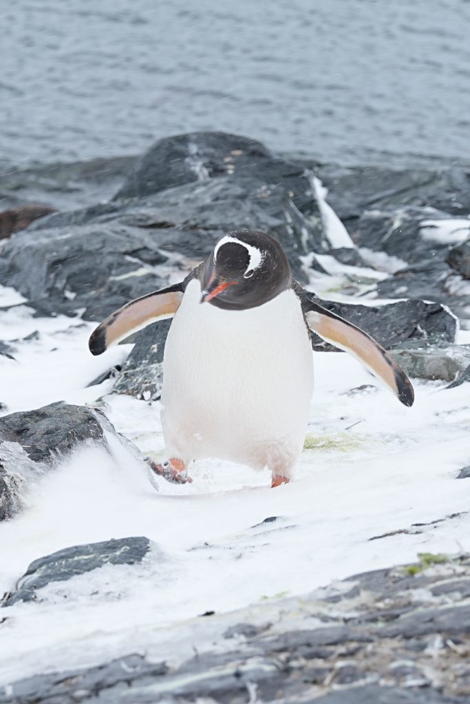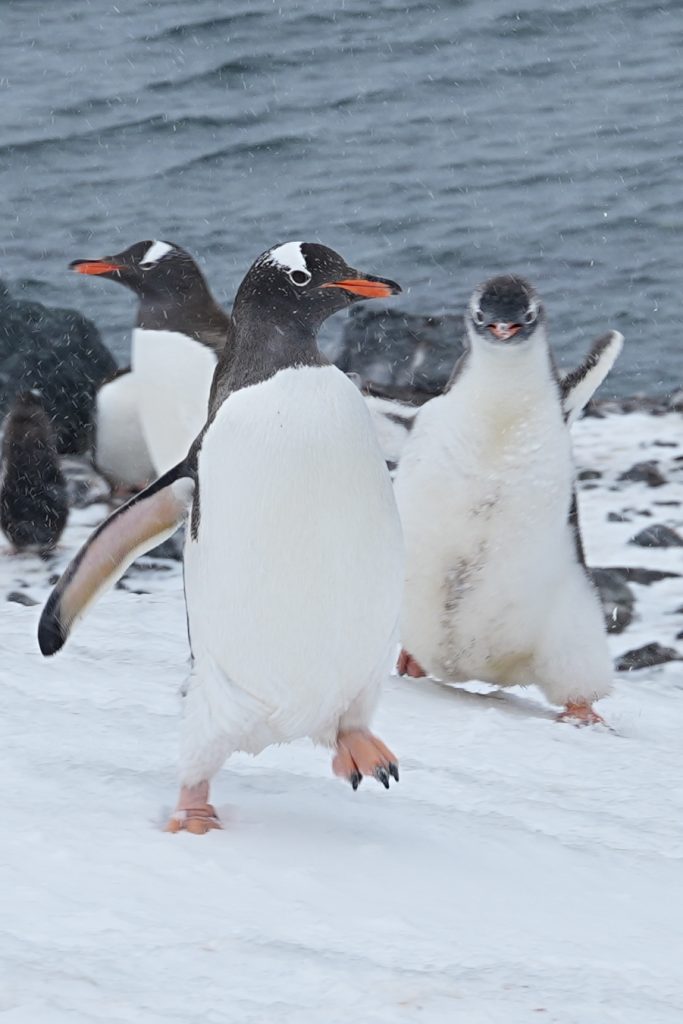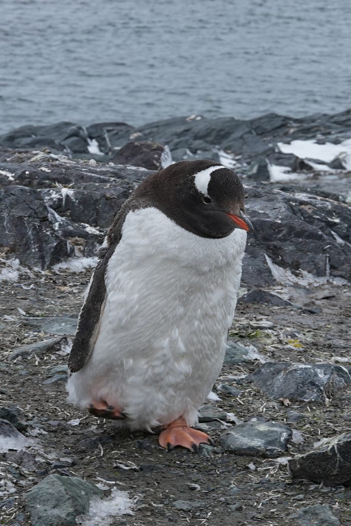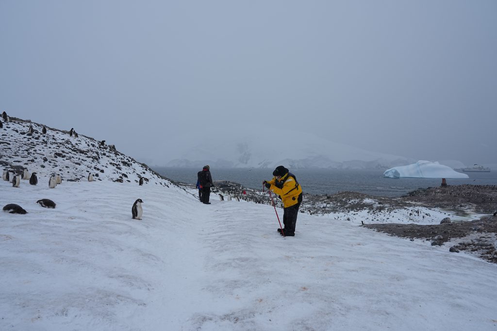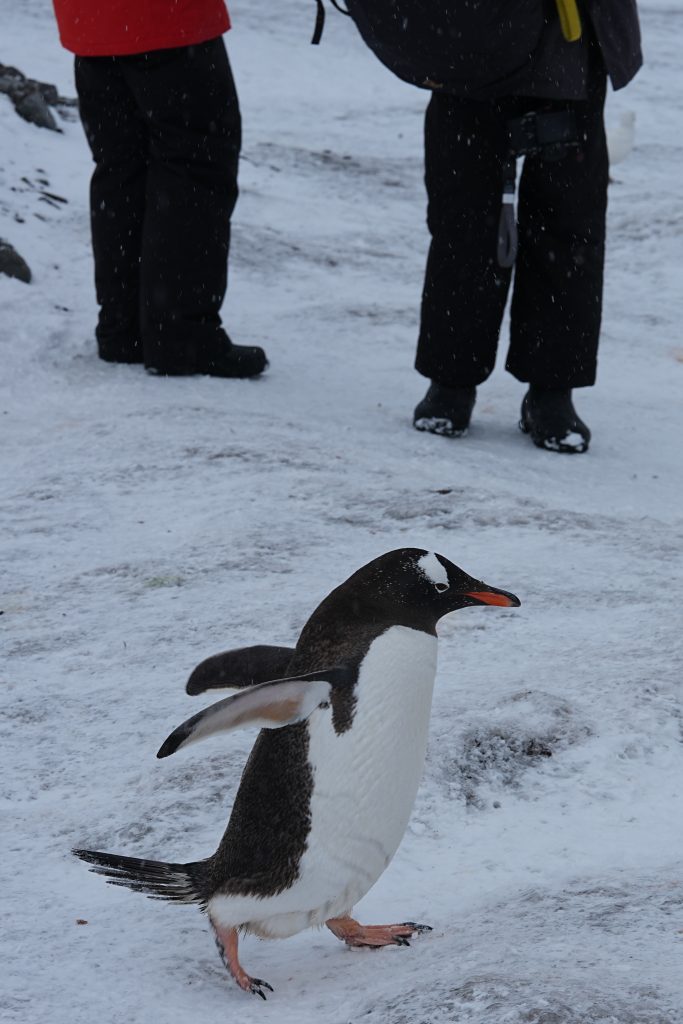 这天多云而后飘了一些雪籽,但并没有我们想象的南极这么冷。登上岸,就有企鹅迎接我们。