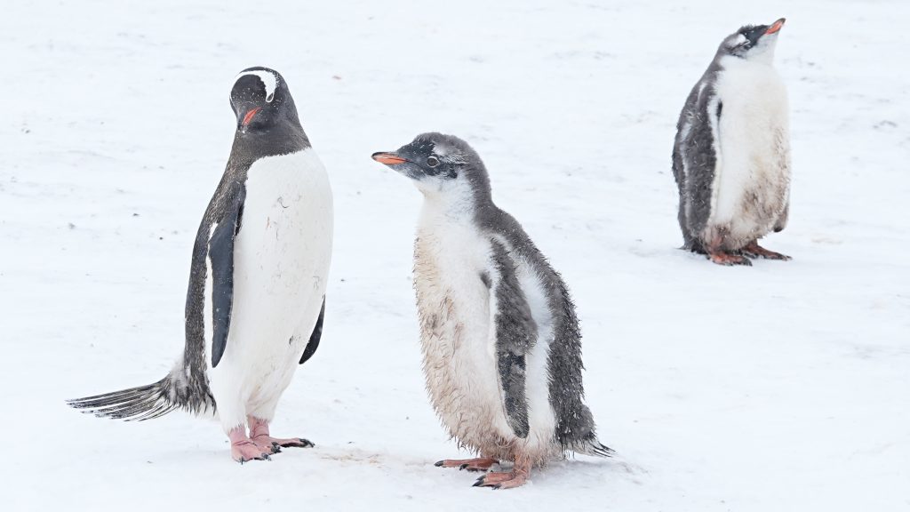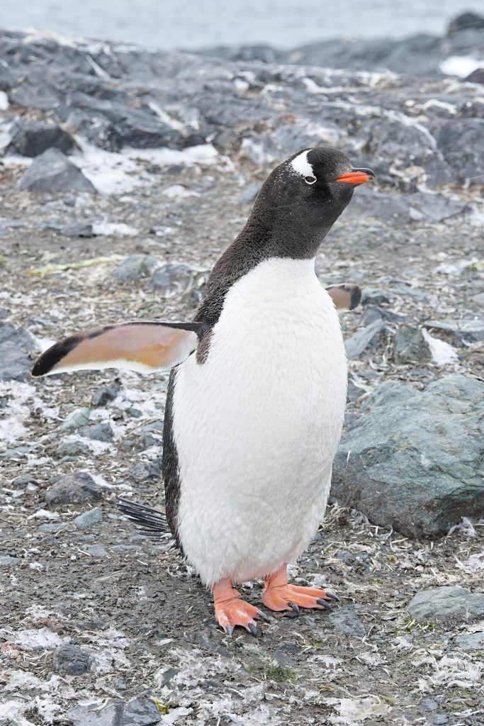 巴布亚企鹅在南极半岛附近非常常见。它们有亮橙红色的喙,黑色的背部,白色的腹部,橙色的脚。头顶有一条宽宽的白色条纹,幼年的小企鹅没有那条白色条纹。