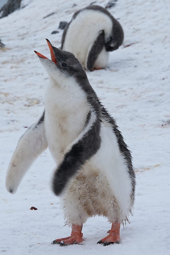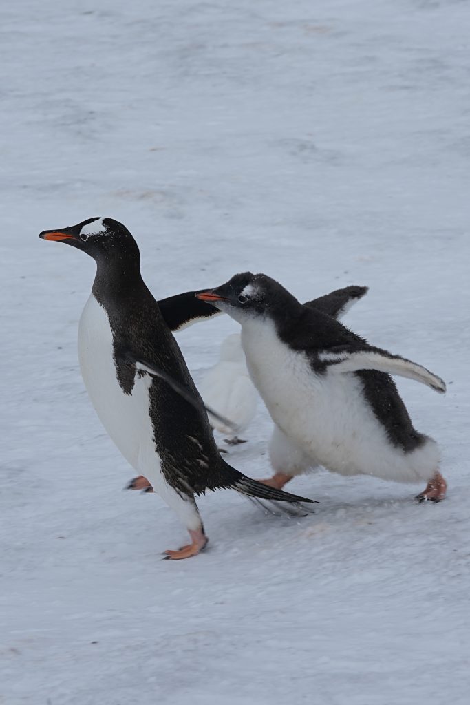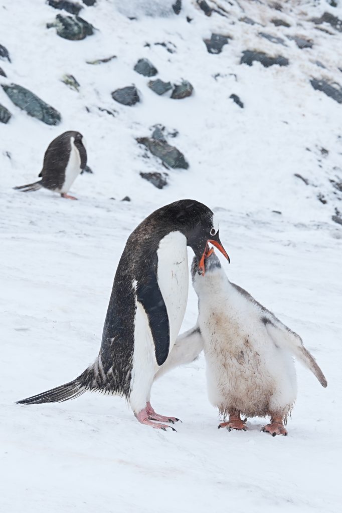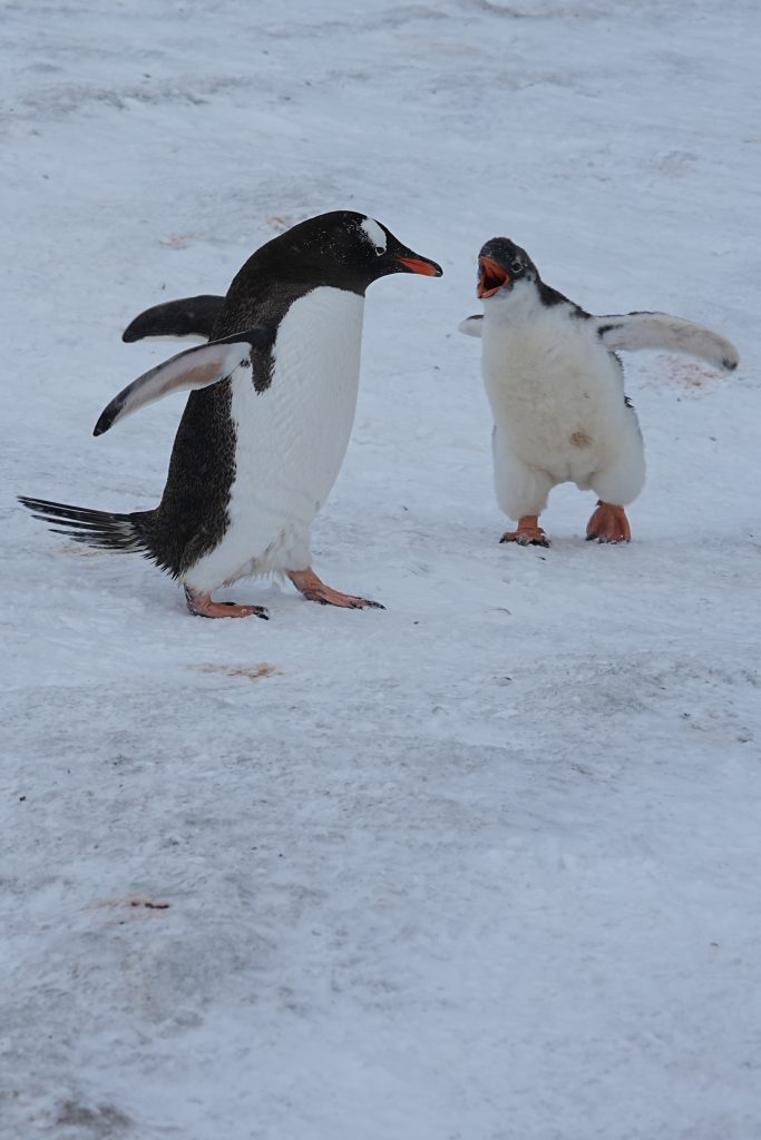 看到许多企鹅带着小企鹅。二月份正是雏鸟成长的高峰期。南极企鹅十一月产卵, 通常一窝两个蛋。父母轮流孵卵或前往海里觅食。孵化约35天,大约在十二月初至中旬雏鸟出壳。二月份就长成我们看到的毛茸茸的大雏鸟。